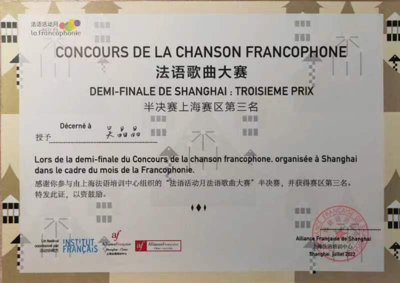 2022全国法语歌曲大赛半决赛上海赛区于9月4日顺利收官!本次比赛以线上线下相结合的方式举行,12名参赛选手以线上方式参加比赛,评审团采取线下到场评判。sjb官网国际交流学院学生吴晶晶同学在外语学院法语教师朱文婧的指导下,荣获半决赛上海赛区第三名!2022全国法语歌曲大赛半决赛在上海总共进行了三轮比拼,在长达6个月的赛程中,吴晶晶同学始终坚持“信念使快乐真实”,一路过关斩将,从上海赛区的73名选手中脱颖而出。供稿 | 国际交流学院、外语学院