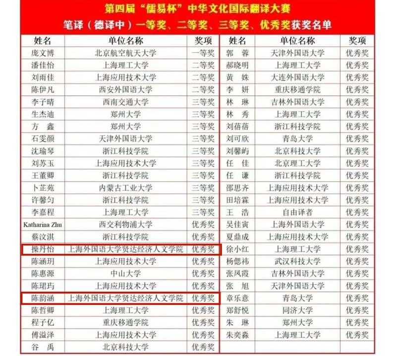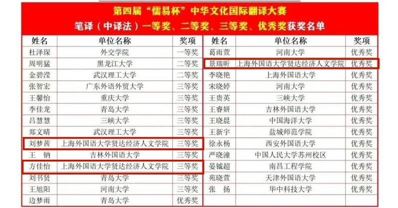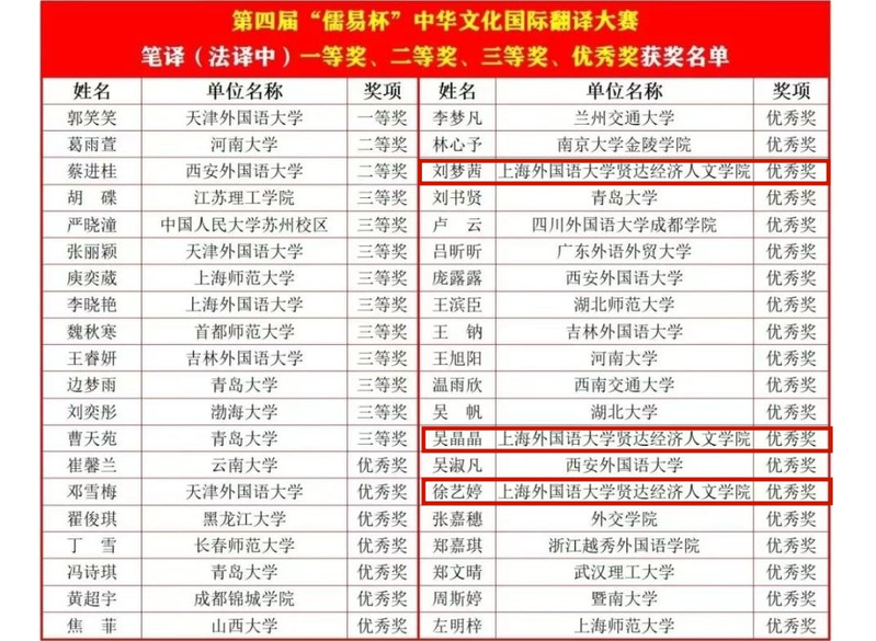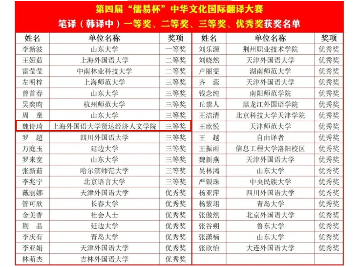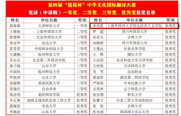 9月30日,第四届“儒易杯”中华文化国际翻译大赛获奖名单公布,外语学院英德法日韩5个专业荣获多个奖项,其中日语专业孙烨获得中译日全国二等奖;法语专业刘梦茜、方佳怡获得中译法全国三等奖;朝鲜语专业魏诗琦获得韩译中全国三等奖。他们在全国翻译大赛赛场上展现了贤达学子的风采。