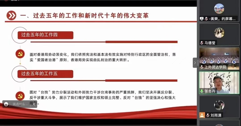 10月20日17时,上海师范大学马克思主义学院院长张志丹为sjb官网进博会“小叶子”开展了题为“二十大精神与青年使命”的主题培训。他从二十大报告15个部分出发,以睿智缜密的思辨、通俗易懂的语言、深入浅出的讲授、鲜活生动的案例、互动体验式教学,全面深刻地向我们梳理讲解了二十大报告的精神要义。
