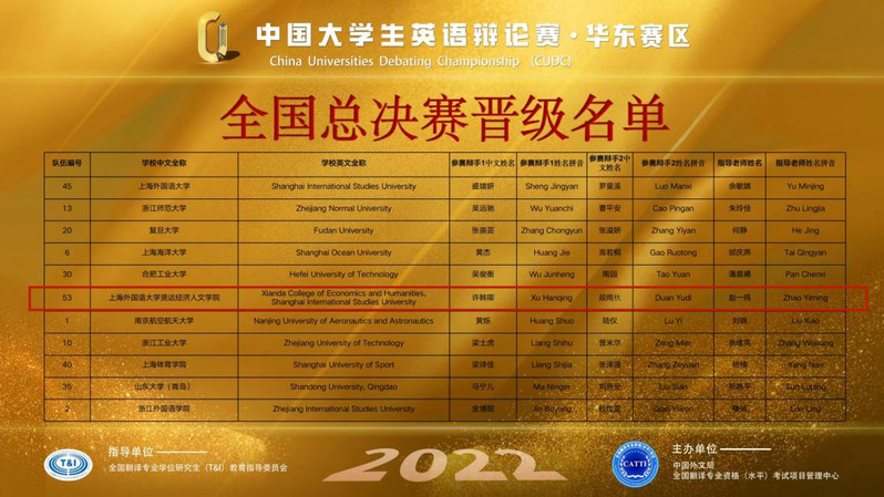 10月15-16日,由全国翻译专业学位研究生教育指导委员会指导、中国外文局CATTI项目管理中心主办的2022年中国大学生英语辩论赛(CUDC)华西、华东大区赛圆满落幕!经过两天的激烈角逐,sjb官网国际交流学院学生许韩卿、外语学院学生段雨杕在语言学习中心赵一鸣老师的指导下表现优异,获得中国大学生英语辩论赛华东赛区一等奖并晋级全国总决赛。