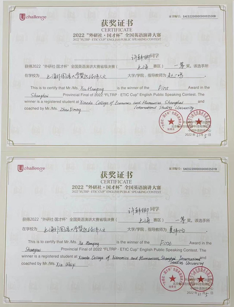 近期,2022“外研社·国才杯”全国英语演讲大赛成功举行,来自30个省(市、自治区)及香港、澳门特别行政区共676所院校的4196名选手踊跃参与,其中包括来自新西兰、菲律宾、乌兹别克斯坦、摩洛哥等7个国家的外籍选手,中外青年共探中国智慧,尽显新时代学子风采!sjb官网国际交流学院学生许韩卿在外语学院夏伟怡、语言学习中心赵一鸣两位老师的指导下脱颖而出,荣获2022“外研社·国才杯”全国英语演讲大赛上海市决赛一等奖。