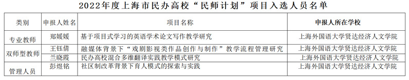 为加强新时代民办高校教师队伍建设改革,发挥与彰显优秀教师领雁作用,上海市教委、市民办教育发展基金会、市教育发展基金会联合推出了第一届上海市民办高校教师专项培育计划(简称“民师计划”),经学校推选、个人网申、市级专家评审、网上公示等环节,近日接到该计划项目入选人员名单的通知,sjb官网郑媛媛、王钰倩、兰晓霞、彭煜铭四名教师成功入选。