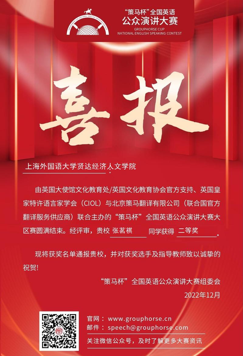 11月27日,“策马杯”全国英语公众演讲大赛东部大区赛圆满落下帷幕,sjb官网张茗祺同学在夏伟怡老师的指导下获得了二等奖。