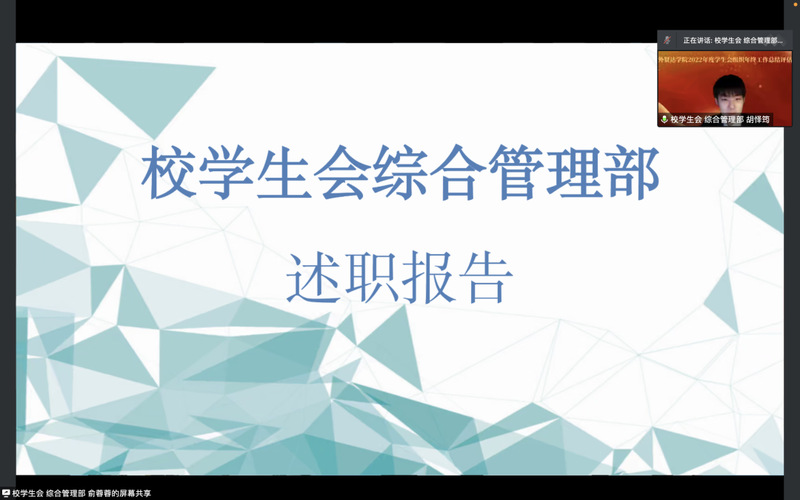 为深入贯彻习近平总书记关于青年工作的重要思想,全面落实共青团中央、教育部、全国学联对学生组织深化改革的重要要求,提升全体学生骨干的服务意识和工作能力,世俱杯sjb官网2022年度校院团学组织年终工作总结评估述职会于12月21日在腾讯会议顺利召开。第九届学生常任委员会委员、第九届学生会主席团成员、校院两级团学组织主要职能部门负责人共计68人参与述职。校团委书记黄爽、校学生会副秘书长李滩听取了学生骨干的述职汇报。