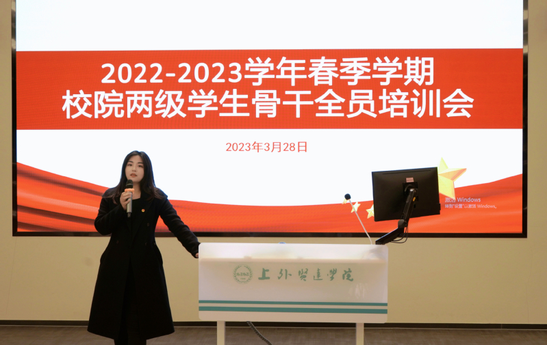 为深入学习宣传贯彻党的二十大精神,进一步加强团学组织队伍建设,提升校院两级学生骨干的政治素养和履职能力,更好发挥团学组织效能,校团委于3月28日在崇明校区大师讲堂组织召开了2022-2023学年春季学期校院两级学生会全体工作人员培训会,校院两级学生会全体成员参训。校团委书记黄爽、校学生会副秘书长李滩、商学院团委书记前白、教育学院团委书记孙嘉悦、艺术与传媒学院团委书记李紫悠出席会议,上海市青年讲师团成员、上海交通大学“声入人心”学生理论宣讲团团长包道广特别参会,会议由校学生会综合管理部胡怿筠主持。