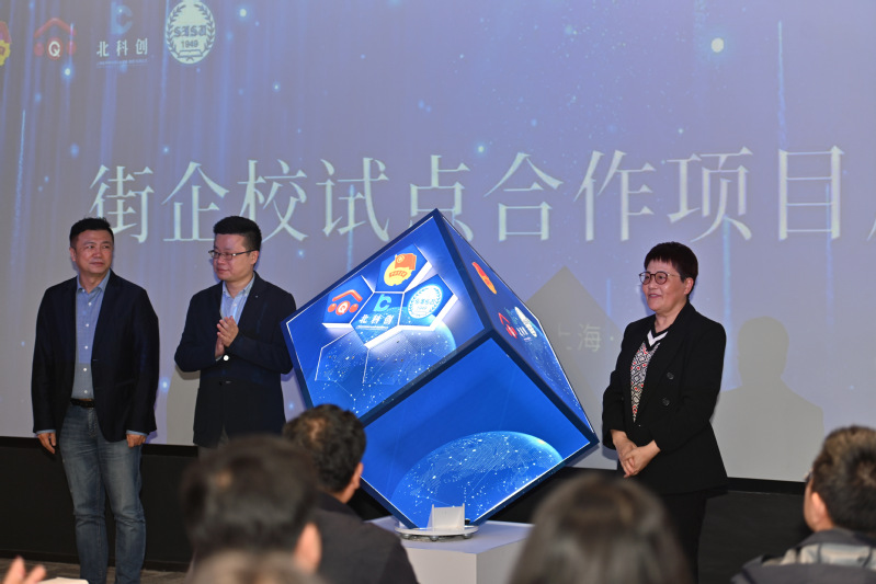 五四青年节区域化团建联合活动在上海国际金融科技创新中心拉开序幕。副校长罗玲芳与街道党工委副书记王佳纬,北科创党委副书记王培青共同启动街企校试点合作项目,点亮魔方。