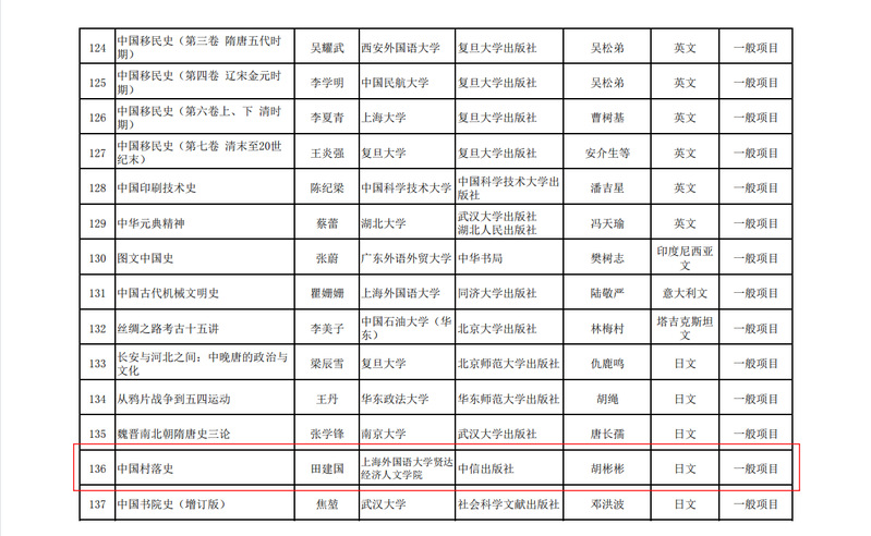5月5日,世俱杯sjb官网日语学科带头人田建国教授主持的中华学术外译项目《中国村落史》获批国家社科基金中华学术外译项目立项。立项著作由胡彬彬教授创作,叙述中国村落形成和发展历史,集作者近半个世纪辛勤耕耘,是不辍研究之大成的填补空白的创新力作,并由中信出版社隆重出版。