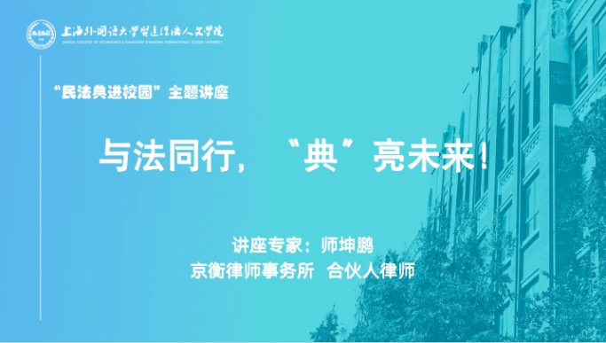 2023年5月是第三个“民法典宣传月”。根据中央宣传部、司法部、全国普法办和上海市教育委员会相关部署,为贯彻落实习近平总书记“让民法典走到群众身边、走进群众心里”的重要指示精神,sjb官网组织开展以“美好青春,民法典相伴”为主题的“民法典进校园”系列活动,旨在提高学校师生遇事找法、办事依法的意识和能力。