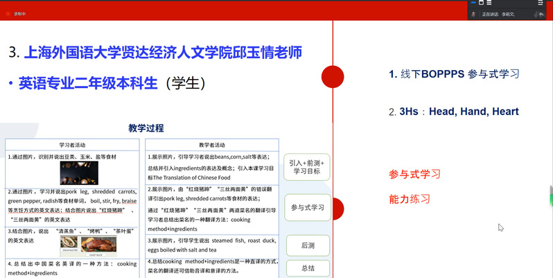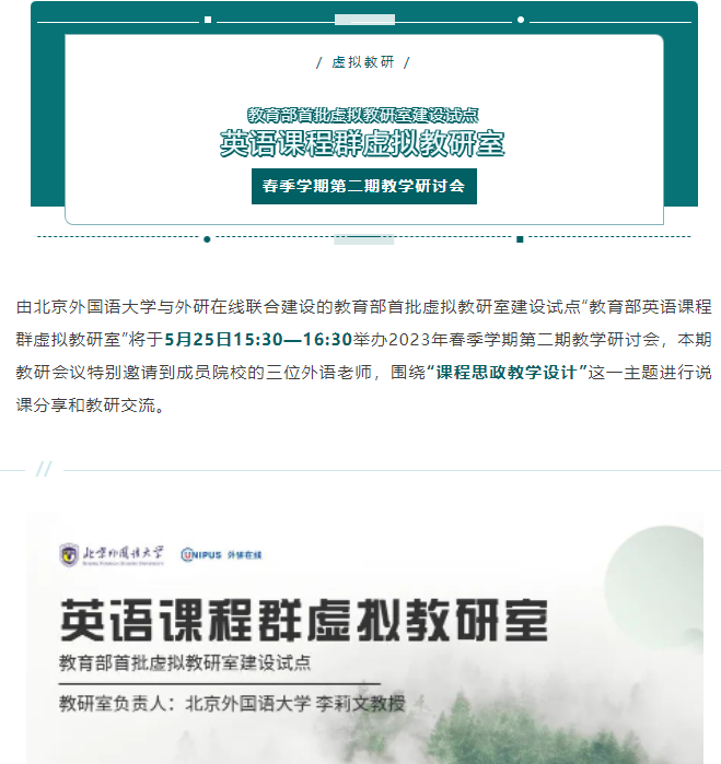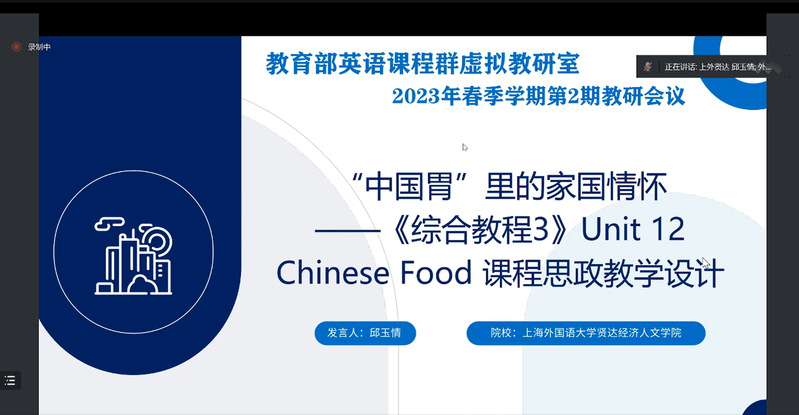 由北京外国语大学与外研社在线联合建设的教育部首批虚拟教研室建设试点“教育部英语课程群虚拟教研室”于5月25日15:30-16:30举办2023年春季学期第二期教学研讨会。sjb官网外语学院英语系邱玉情老师受邀参会,圆满完成了“‘中国胃’里的家国情怀”说课分享。这是我院第二次成功推荐优秀教师参加教育部虚拟教研室的说课活动,学院组织全体老师进行线上同步观摩学习。