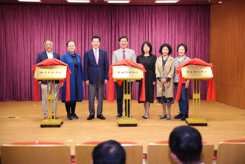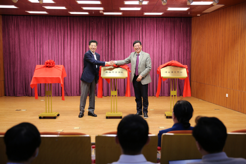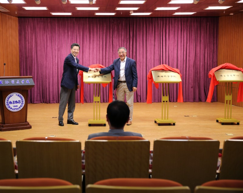 会上,校长郑方贤宣读了机构调整决定。董事长鲍贤嗣分别与数据科学学院、数字文旅学院、语言学习中心领导为新学院、中心揭牌。
