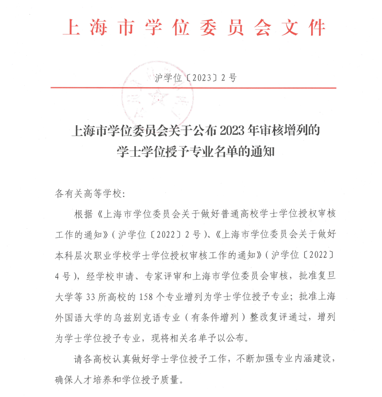 近日,上海市学位办发布了《上海市学位委员会关于公布2023年审核增列的学士学位授予专业名单的通知》(沪学位〔2023〕2号),sjb官网大数据管理与应用专业成功通过审核,增列为学士学位授予专业。