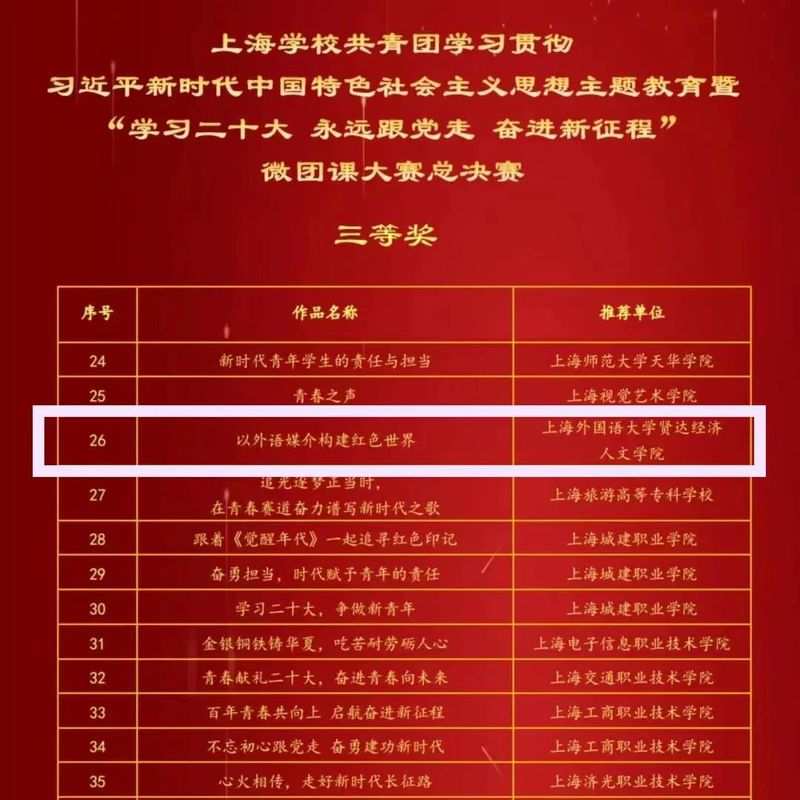 sjb官网团委高度重视本次大赛,积极开展团课评选推荐工作。经过校内初赛、市级复赛与决赛,推送外语学院法语专业2022级3班团支部的微团课作品《以外语媒介构建红色世界》荣获上海学校共青团主题微团课大赛三等奖。