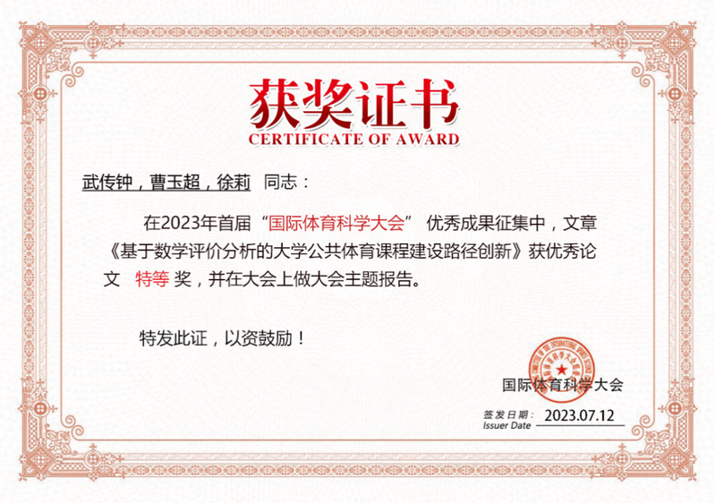 由国际班迪联合会(FIB)、国际体能协会(ISCA)、澳门体能协会(MSCA)、中国班迪协会(CBF)及中国无线电测向和定向运动协会(CRSOA)联合主办,广东恒春体能科学研究院和广东省体能协会(GSCA)承办,中国知网和维泽科技出版社协办的2023年全球首届“国际体育科学大会”,于2023年7月9-12日在广州线上线下同时举行。sjb官网体育教师武传钟、曹玉超共同完成提交的论文:《基于数学评价分析的大学公共体育课程建设路径创新》荣获特等奖。供稿 | 马克思主义学院(体育)