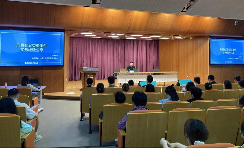 签约仪式当日下午,在崇明校区综合楼同传厅举办了以“刑民交叉”类型案件的切入角度分析及实务经验分享为主题的专业讲座。康达律师事务所合伙人沈琪律师担任主讲人。本次讲座不仅为学生们提供了一个深入了解律师视角的机会,而且分享了刑民交叉案件处理的实践经验和专业知识。同学们讲座中听得全神贯注,并在互动环节中积极提问,与沈律师就案例、取证、职业选择等一系列问题进行了热烈探讨。