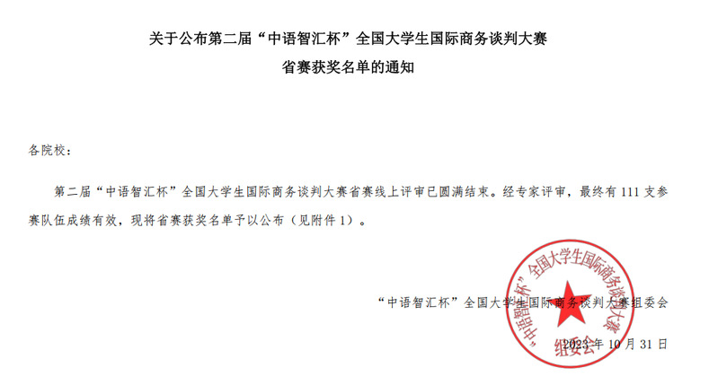 sjb官网外语学院对此次赛事高度重视,通过了校级预赛精心选拔,组织了外语学院英语系段雨杕、张菡清、黄靖函和国交学院张祚阳4位同学的参赛团队,在外语学院贾雪莱和夏伟怡两位老师的悉心指导下,将课上所学的商务谈判理论知识和谈判实践相结合,高质量地完成商务谈判英文策划书的撰写,以卓越的团队协作和竞技语言表达能力,力挫群雄,强势斩获团队第一。