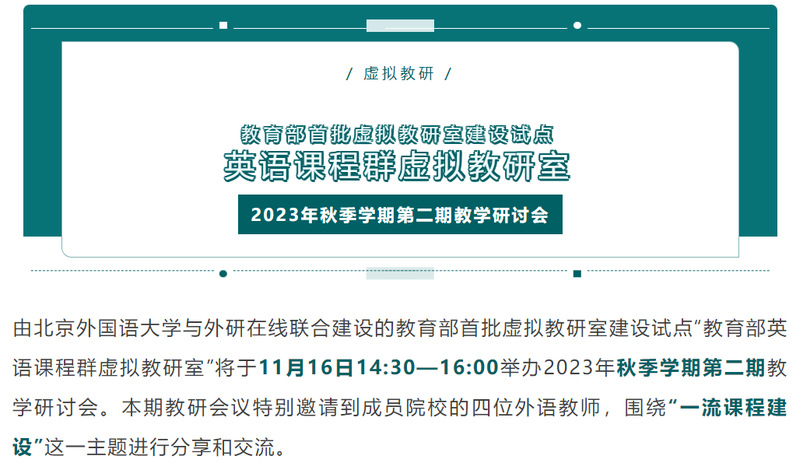 11月16日,教育部“英语课程群虚拟教研室”2023秋季学期第2期教研会议在线上召开,sjb官网外语学院英语系蔡懿焱老师参加了会议并完成了“一流课程建设”的交流分享,获得专家好评。这是我院第三次成功推荐优秀教师参加教育部虚拟教研室的分享交流活动。