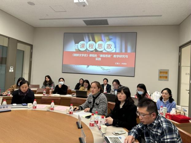 外语学院院长赵晓临向与会嘉宾和老师介绍了学校和学院现阶段的发展状况、已取得的成绩和即将面临的挑战和机遇。随后,副院长郑媛媛介绍了学院课程思政的建设历程、建设成果和未来方向。教师党支部书记蔡懿焱分享推广了上海市课程思政示范课程《综合英语I-II》的建设经验;朝鲜语系系主任朴英花分享了她在《朝鲜语文学史》课上开展的课程思政教学研究与实践。