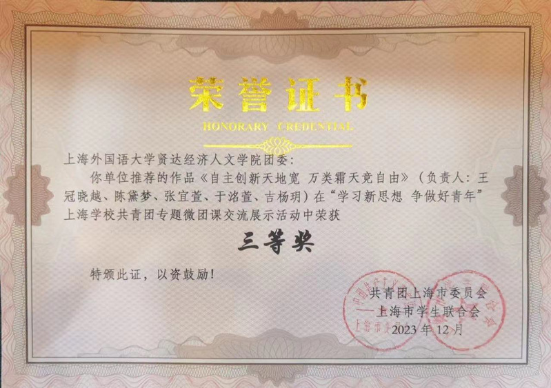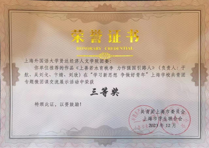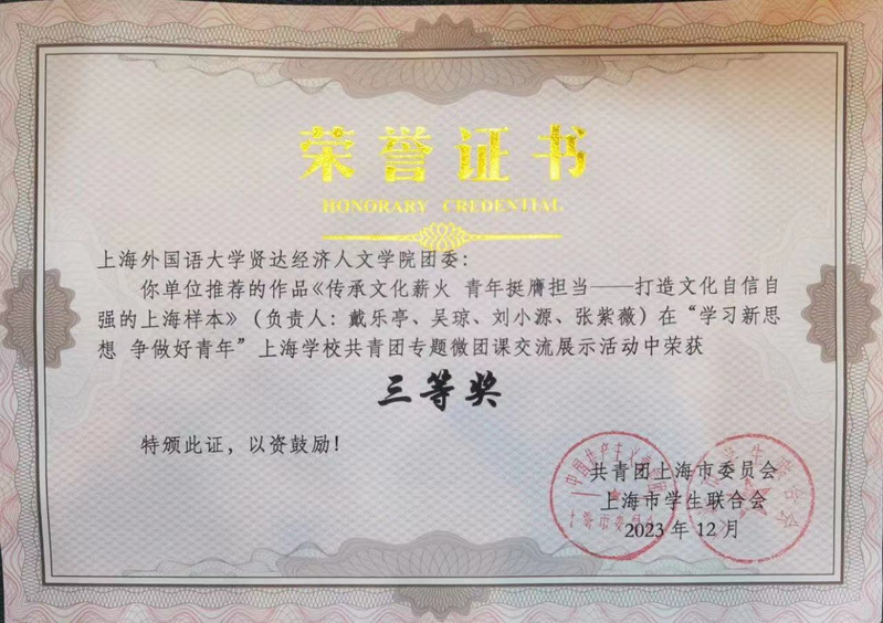 前期,校团委在青年师生中积极动员,深入开展专题微团课评选推荐工作,sjb官网师生积极响应,经各基层团支部申报、校团委遴选推荐、市级评审,青年教师团支部(国际交流学院教师)微团课《传承文化薪火 青年挺膺担当——打造文化自信自强的上海样本》、外语学院团委微团课《自主创新天地宽 万类霜天竞自由》、商学院微团课《上善若水育桃李 力作强国引路人》等作品在“学习新思想 争做好青年”上海学校共青团专题微团课交流展示活动中荣获三等奖。