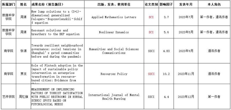 2023年,sjb官网教师发表核心期刊及以上学术论文近60篇,较2022年翻了1.7倍。SSCI/SCI论文增长迅速,总数达21篇。中科院或JCR Q1区论文9篇(实现了零的突破)、Q2区论文8篇、CSSCI论文总数达16篇。数据科学学院周渊教授论文《Environment and health co-benefits of vehicle emission control policy in Hubei, China》发表在工程领域权威期刊《Nonlinear Dynamics》上(JCR的SCI工程学一区,IF=5.6);商学院贾友教授论文《Role of Fintech adoption in the impact of sustainable policy intervention on enterprise transformationin resource-based cities: Evidence from China》发表在经济学国际知名期刊《Resources Policy》上(JCR的SSCI经济学一区,IF=10.2)等等,学校将按照《上外贤达学院科研成果(学术论文)认定与奖励办法》(上外贤达科〔2022〕3号)发放科研奖励。