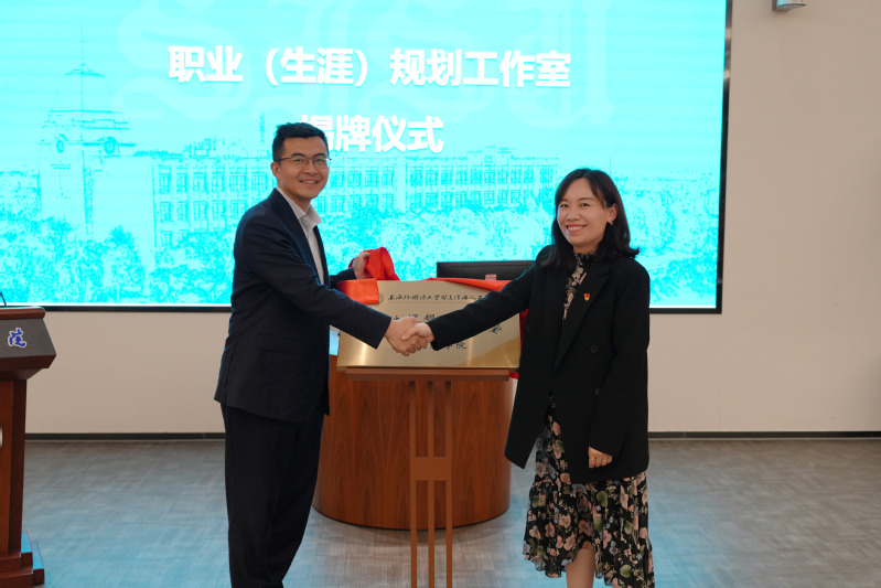 随后,招生与就业办公室陈伟主任和国际交流学院党总支王磊书记共同为国际交流学院职业生涯规划工作室揭牌,宣布工作室正式成立。