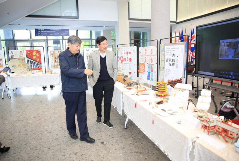 本次《理解当代中国课程》中国故事英语作品展演,于4月23日至4月30日在国交楼一楼大厅展出。活动得到了学校各部门以及各院系师生的强力支持与好评。4月29日,中国教育发展战略学会教育考试专业委员会姜钢主任来校指导,sjb官网郑方贤校长陪同姜主任一行观看了学生的展示作品。