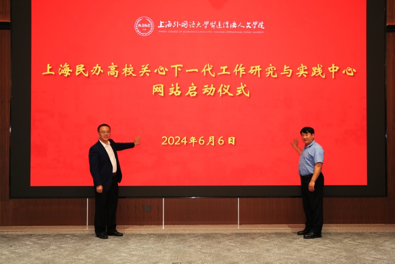 图1.市民办高校党工委副书记江鸿波与上外贤达学院党委书记赵荣善上台共同启动网站