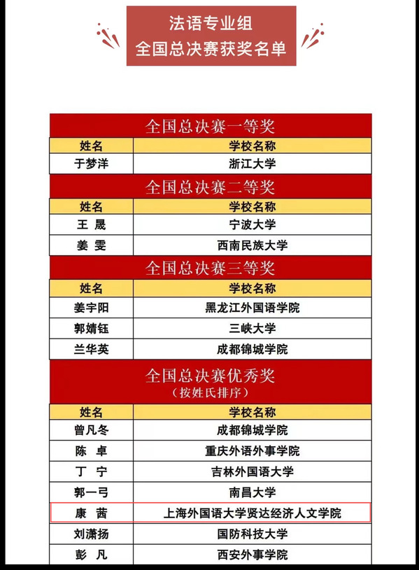 近日,2024年外研社“教学之星”大赛全国总决赛公布了获奖名单,经过激烈的角逐和专业评审的严格筛选,sjb官网外语学院法语系康茜老师在众多参赛者中脱颖而出,荣获法语专业组全国总决赛优秀奖。
