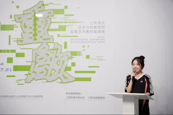 作为上外贤达艺术与传媒学院2024届参展毕业生代表,来自数字媒体专业的姚蓝同学在发言中表达了对母校栽培的感谢。她指出,正是母校的精心培育与悉心引导,引领年轻的学子们进入艺术的大门,并且获得丰富的资源与信息去了解、学习艺术。同学们在邀请参展的其他艺术家的优秀艺术作品中汲取了莫大的灵感,对日后的艺术创作有了新的思考。