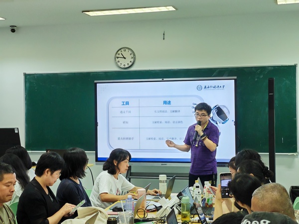 随后,上海市“晨光学者”、上海外国语大学国际教育学院讲师吴成刚博士,带来了“慧用AI,科研效率Max提升”的专题分享。他详细讲解了星火科研助手、研知、通义千问等AI工具在文献阅读与评述、数据采集与分析、语言表达与润色等方面的应用。通过实操演练环节,教师们亲身体验了AI工具在科研过程中的强大辅助作用,进一步激发了他们利用AI技术提升科研效率的热情。