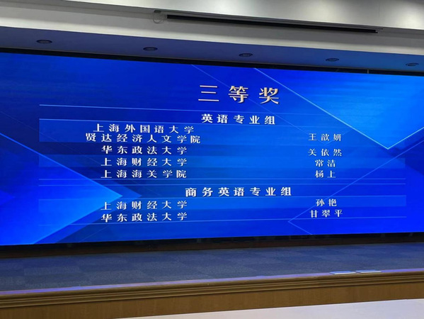 9月7日,第十五届“外教社杯”全国高校外语教学大赛(外语类专业组)上海赛区比赛在华东理工大学举行。经过激烈角逐,我校外语学院王歆妍老师荣获英语专业组三等奖。