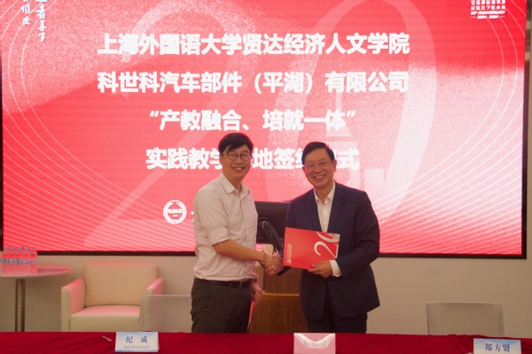 论坛的第二阶段议题聚焦于“国际化人才培养”。在这一环节,上外贤达学院与科世科汽车部件(平湖)有限公司举行了实践教学基地签约仪式,由郑方贤校长和纪成总经理共同签约。随后,科世科汽车部件(平湖)有限公司纪成总经理带来了“新经济环境下中国企业全球化与高校人才培养”的主题报告,他结合自己丰富的跨国企业工作经验,深入剖析了新经济环境下中国企业全球化对高校人才培养的新要求。