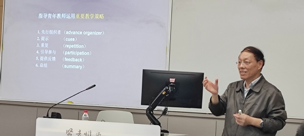 讲座中,张祖忻教授紧扣“教学设计的若干要点”,全面解析了基于行为主义心理学和认知心理学的教学设计九大核心要素。通过生动的案例与深入浅出的讲解,参训人员在教学设计理论和方法上收获了诸多启示。张教授特别强调学习动机的激发,引入凯勒的ARCS模型,并分享了关于“课程思政”的深刻见解,为非教岗人员如何在自身授课实践和教学管理中融入价值引领提供了思路。参训人员听讲投入,讲座结束后与张教授进行了交流。