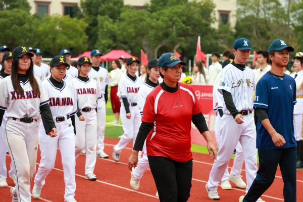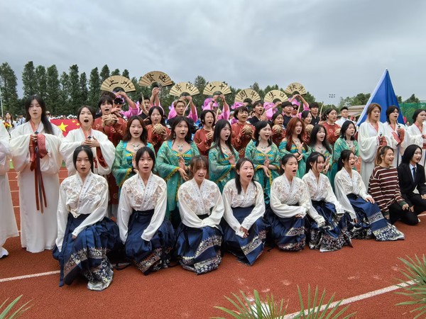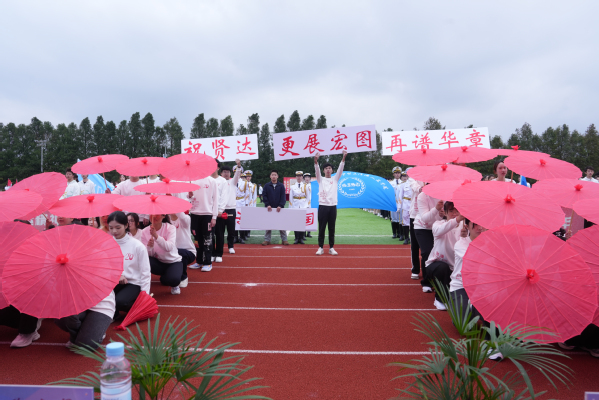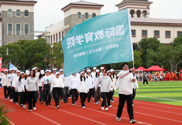入场式开始,伴随着高昂优美的《我爱你,中国》旋律,学校国旗队队员高举鲜艳的五星红旗和学校校旗队步伐矫健地走进体育场。现场奏响节奏鲜明的《运动员进行曲》,由八名男同学肩扛“传承奥运精神、争做强国青年”两块牌匾走在前面,紧随其后的是由36名男同学和36名女同学组成的刀旗方阵和花束方阵。国际教育学院、数据科学学院、艺术与传媒学院、商学院、外语学院、教育学院、数字文旅学院、国际交流学院等各学院代表队和学校棒垒球队、教职工队伍依次入场,每支队伍行进到主席台前,都通过各种形式的表演,表达了对学校20周年校庆的祝福。校领导、嘉宾和全场观众起立用热情的掌声和欢呼声欢迎各支队伍入场。