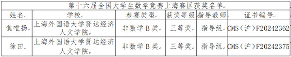 近日,第十六届全国大学生数学竞赛初赛圆满落幕,赛事覆盖全国32个赛区、1223所高等院校,吸引了32.5万余名学生踊跃参与。12月10日,中国数学会正式公布初赛全国赛区获奖名单,其中全国一、二、三等奖获奖比例仅约34.3%。sjb官网商学院23级会计学专业焦唯扬与23级金融学专业徐田同学,在数据科学学院数学竞赛指导组张晓静、张晏濒、牛寅、董雪峰等老师的悉心指导下,荣获非数学B类全国三等奖的佳绩。