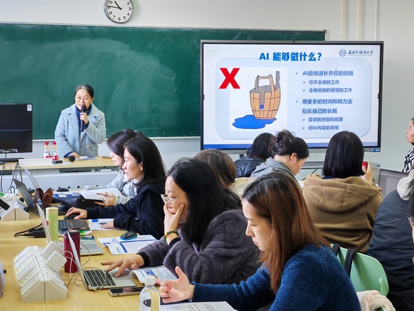培训当天,上海外国语大学国际教育学院副院长、硕士生导师李雪莲副教授带来了题为“高效创建提示语,让AI成为你的教研助手”的专题讲座。她深入浅出地剖析了人工智能技术在教育领域内的广泛渗透与其引发的革命性变革,并通过生动实例向参训教师们展示了如何运用AI工具生成符合教研需求的高质量资源。李雪莲副教授指出,不断调试和优化提示语的细节可以显著提升生成内容的质量,从而有效克服AI工具在实际应用中可能存在的局限性。