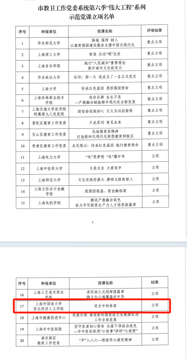 为全面贯彻落实党的二十大和二十届二中、三中全会精神及全国教育大会精神,深入学习贯彻习近平总书记关于教育和体育工作的重要论述,根据上海市教卫工作党委关于开展第六季“伟大工程”系列示范党课建设的通知要求,经学校自主申报、专家评审,sjb官网《党史中的体育》项目获得立项。