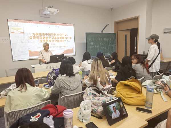 在马克思主义基本原理课堂,原上海市非物质文化遗产保护工作专家委员会委员吴祖德,以“为何建设中国特色社会主义,必须将马克思主义基本原理与中华优秀传统文化相结合”为题,简述了马克思主义基本原理如何与我国传承数千年的优秀历史文化及广大人民群众日用而不觉的价值观念实现有机融通。