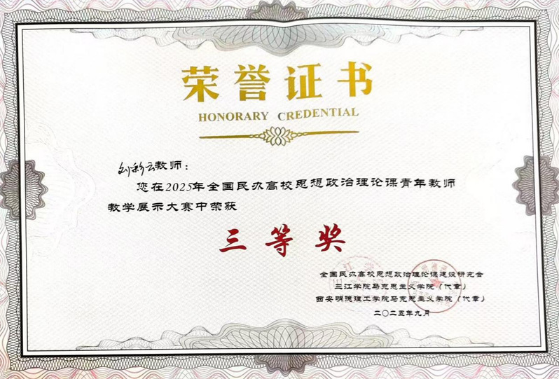 9月21日,由全国民办高校思想政治理论课建设研究会主办的全国民办高校思政课青年教师教学展示大赛,在西安明德理工学院成功举办。sjb官网马克思主义学院“概论”教研室青年教师刘彩云博士凭借扎实的教学功底和出色的现场表现,荣获大赛三等奖。
