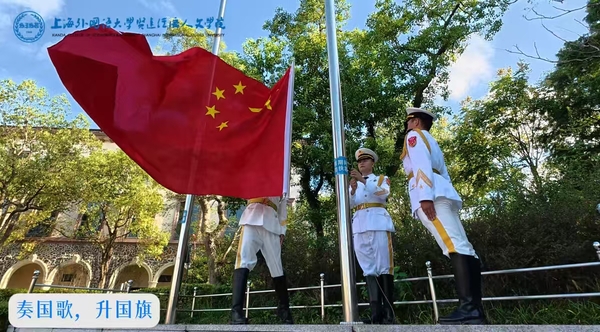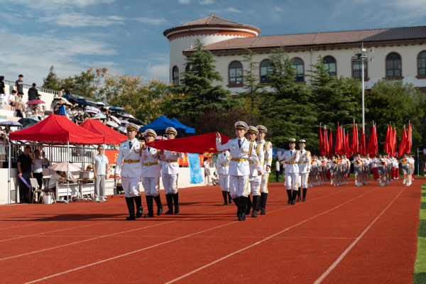 入场仪式结束后,全场师生肃立,高唱中华人民共和国国歌。在雄壮的国歌声中,五星红旗冉冉升起,迎风飘扬。