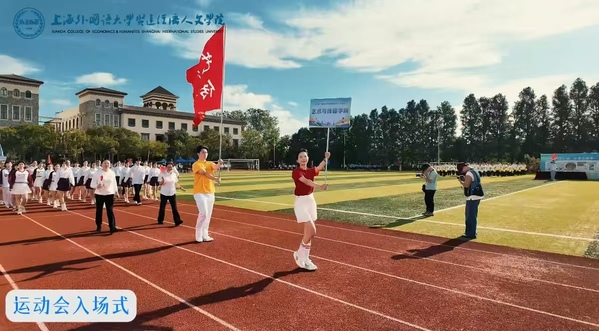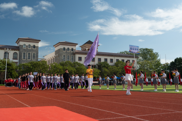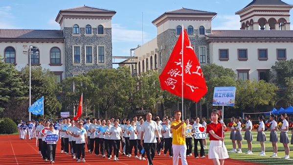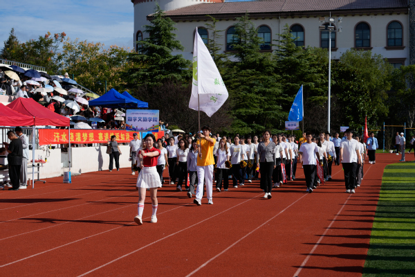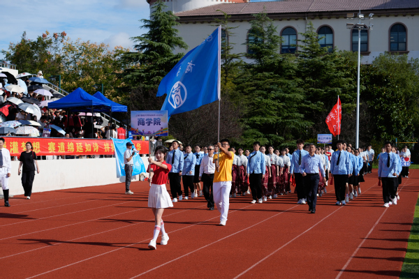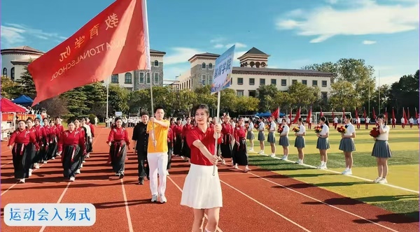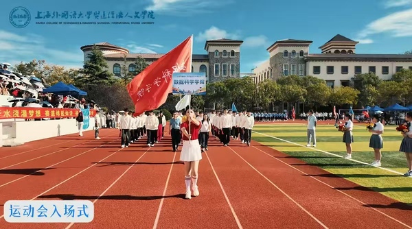 在激昂的《运动员进行曲》,入场式正式开始。国旗护卫队和校旗护卫队率先入场,紧随其后的是花束方阵与红旗方阵,他们步伐整齐、精神抖擞。随后,艺术与传媒学院、国际交流学院、音乐学院、教育学院、国际教育学院、外语学院、数据科学学院、数字文旅学院、商学院、棒垒球队以及教职工代表队依次入场。各学院方阵通过富有创意的表演形式,充分展现了贤达师生积极向上、团结奋进的精神风貌。