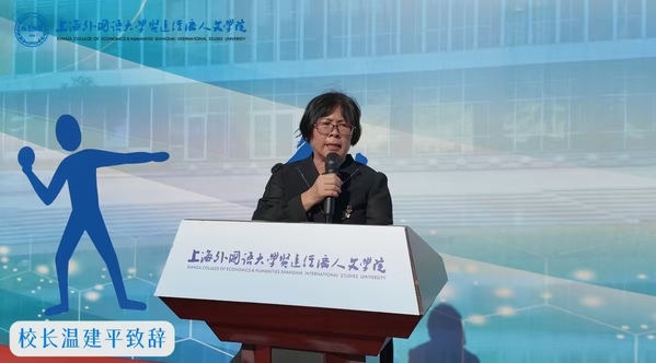 温建平校长为运动会致辞。她回顾了过去一年学校在体育工作中取得的丰硕成果,并指出,体育是高校落实立德树人根本任务、培养担当民族复兴大任的时代新人的必修课。它不仅能强健学生的体魄,更能磨炼学生的意志,培养学生的团队合作精神和竞争意识。她希望同学们在赛场上尽情挥洒汗水,锻炼体能、磨炼意志、收获友谊,将赛场上的拼搏精神转化为学业和人生道路上的强大动力,勇敢追逐梦想,书写属于自己的精彩篇章。