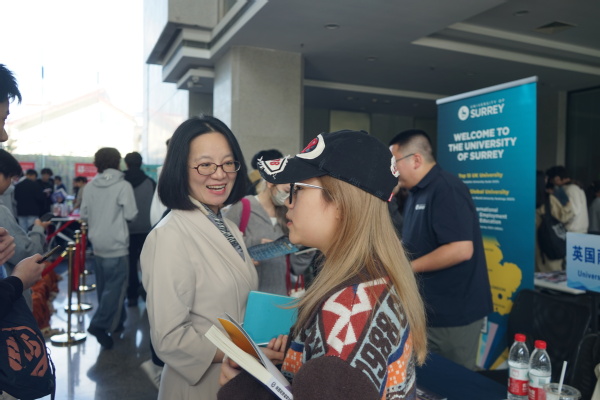 讲座落幕后,海外高校交流会在虹口校区行政楼一楼大厅举行。本次交流会汇聚了来自全球多个国家和地区的优质教育资源:英国萨里大学、东安格利亚大学、肯特大学、布拉德福德大学等知名院校携热门专业亮相,匈牙利多瑙新城大学、加拿大加西大学、新西兰东部理工大学则带来多元化的留学选择,英国文化教育协会更现场提供语言考试咨询服务。