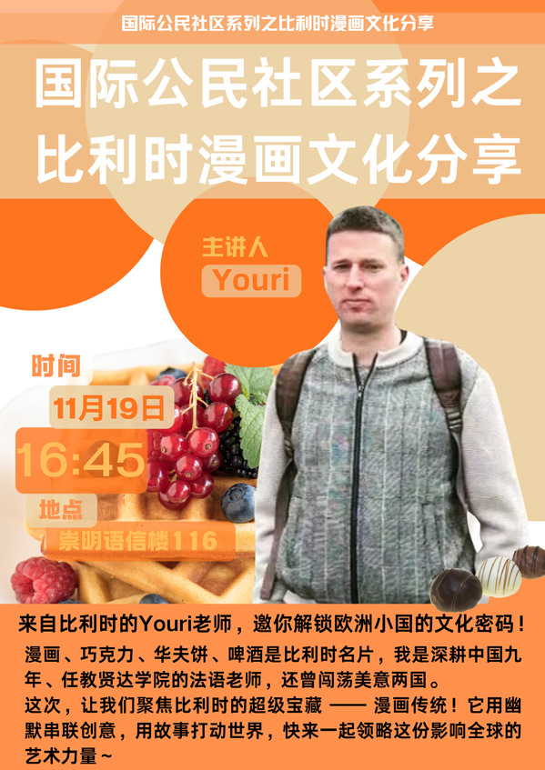 11月19日下午,sjb官网国际交流合作处特邀比利时籍教师Youri,带来“解锁比利时文化密码——聚焦漫画传统”主题分享活动。活动现场座无虚席,师生在生动讲解中探寻比利时漫画的独特魅力。