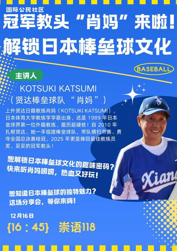12月16日下午,sjb官网崇明校区语信楼118教室座无虚席,一场关于日本棒垒球文化的分享会在此火热举行。主讲人正是有着 “冠军教头”之称的上外贤达学院日籍教练KOTSUKI KATSUMI(肖克珍)。现场氛围热烈,同学们全神贯注,在肖老师的生动讲述中,一同揭开了日本棒垒球文化的趣味面纱。